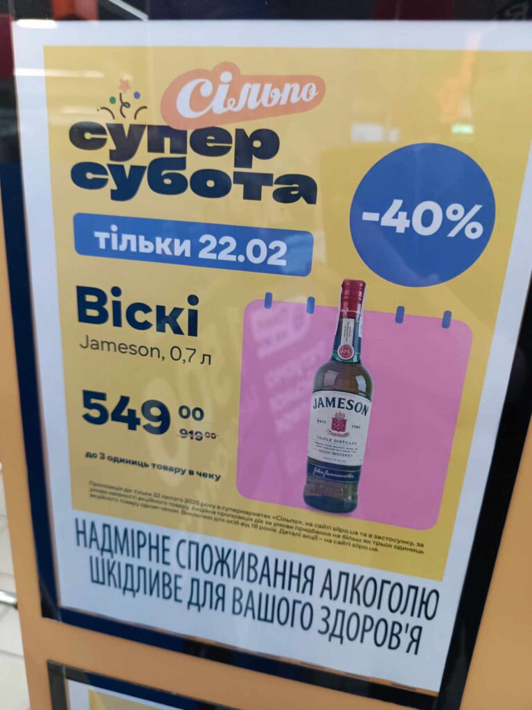 Віскі Jameson, 0,7 л зі знижкою 40% – 549 грн (до 3 одиниць товару в чеку).