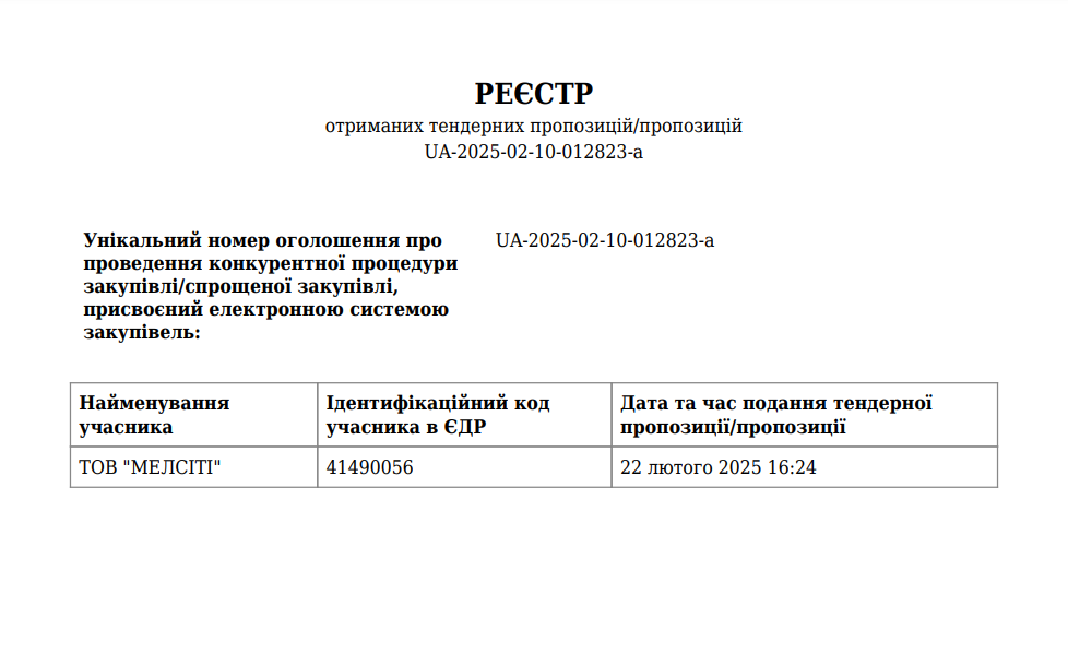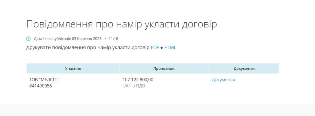 Переможцем тендеру став єдиний учасник відкритих торгів з особливостями ТОВ “Мелсіті”.