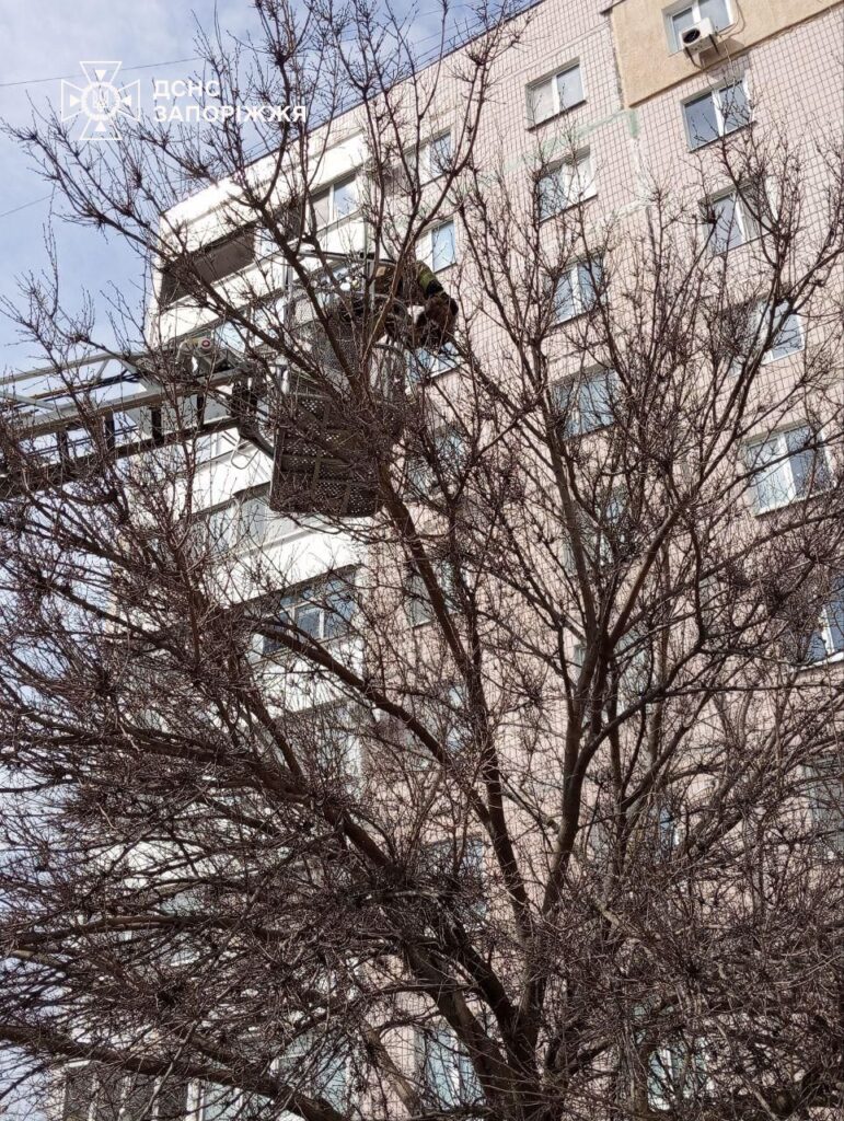 На місце події виїхали співробітники ДСНС. За допомогою автодрабини надзвичайники дісталися до тварини та зняли її з гілки. На щастя, кіт не постраждав.