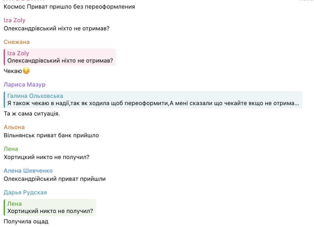 Водночас мешканці Олександрівського району зазначають, що гроші ще не надійшли. Люди активно обмінюються інформацією, уточнюючи, чи отримав хтось кошти, адже процес може відрізнятися навіть у межах одного району.