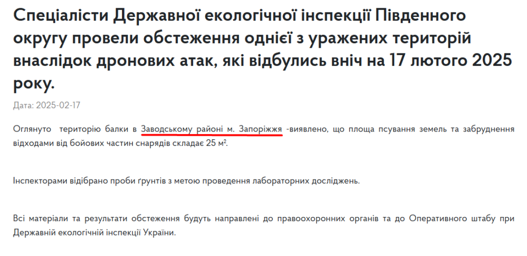 Другим з постраждалих районів виявився Заводський район Запоріжжя. Спеціалісти Державної екологічної інспекції Південного округу оглянули територію балки в Заводському районі м. Запоріжжя та виявили, що площа псування земель та забруднення відходами від бойових частин снарядів складає 25 м².