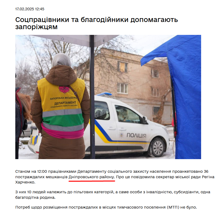 Станом на 12:00 працівниками Департаменту соціального захисту населення проанкетовано 36 постраждалих жителів цього району міста. Потреб щодо розміщення постраждалих в місцях тимчасового поселення (МТП) не було.