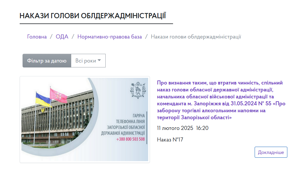 Наразі останнім опридюдненим з наказів голови Запорізької обласної державної адміністрації на офіційному сайті ЗОДА є наказ Про визнання таким, що втратив чинність, спільний наказ голови обласної державної адміністрації, начальника обласної військової адміністрації та коменданта м. Запоріжжя від 31.05.2024 № 55 «Про заборону торгівлі алкогольними напоями на території Запорізької області».