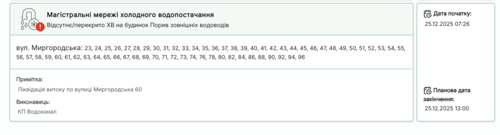 За офіційною інформацією, вода відсутня на вулиці Миргородській у будинках №№ 23–55, а також у частині будинків з непарною та парною нумерацією до №96 включно. Причина — ліквідація витоку на зовнішніх водогонах біля будинку №60.
