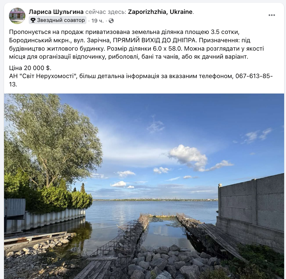 The post У Запоріжжі виставлено на продаж ділянку з виходом до Дніпра за 20 000 $ (ФОТО) first appeared on Портал Акцент.
