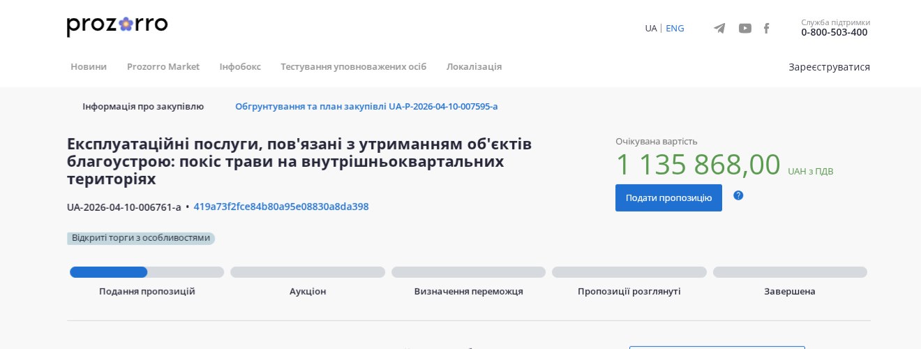 Очікувана вартість робіт становить 1 135 868 гривень з ПДВ, а загальний обсяг послуг — 338 055,79 м².
