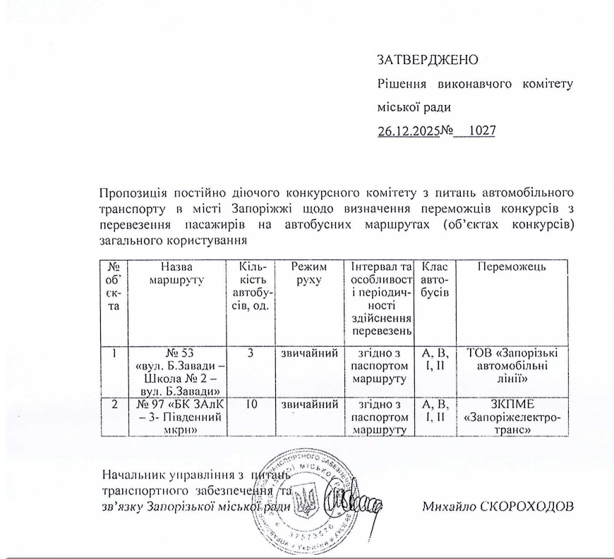 Виконавчий комітет Запорізької міської ради затвердив результати конкурсів з перевезення пасажирів на міських автобусних маршрутах загального користування № 53 та № 97.
