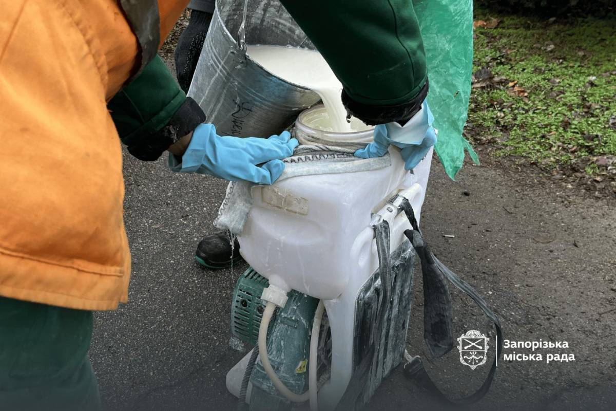 Як пояснила майстерка КРБП «Зеленбуд» Дніпровського району Катерина Симоненко, розчин має специфічний запах, який буде триматися на деревах до кінця зими.