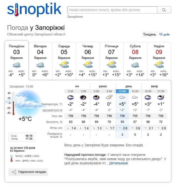 - 5 березня – вночі до +2 градусів, вдень до +10 градусів, без опадів;