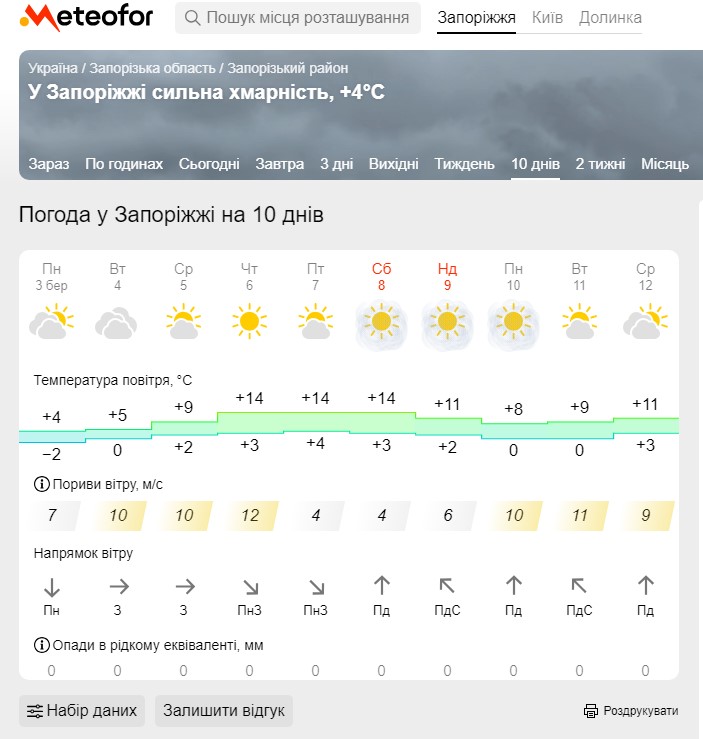 - 6-9 березня – вночі від +2 до +4, вдень від +13 до +16 градусів, без опадів