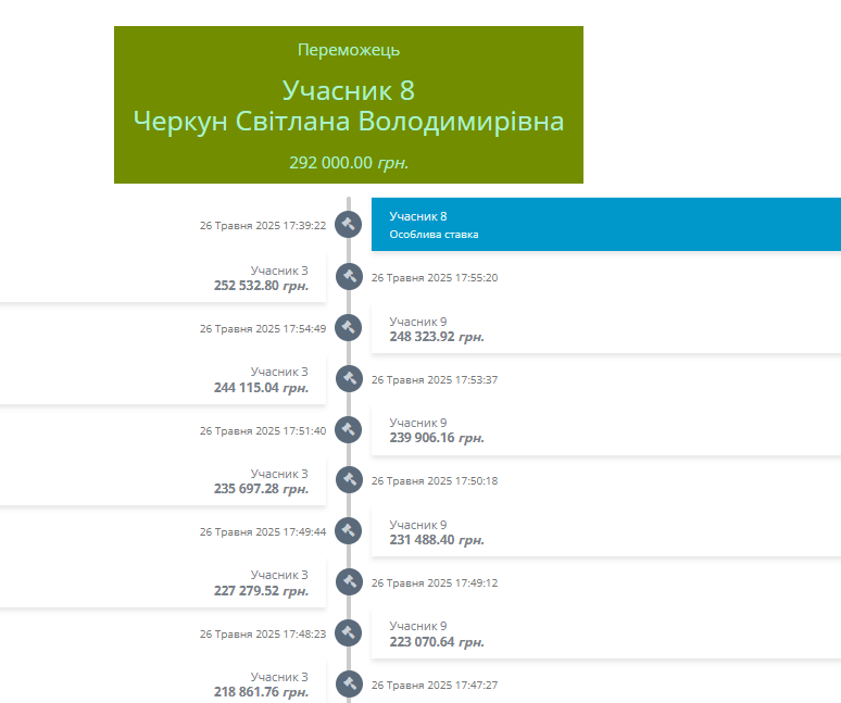 У підсумку, завдяки конкуренції між учасниками, вартість зросла до 292 тисяч гривень.