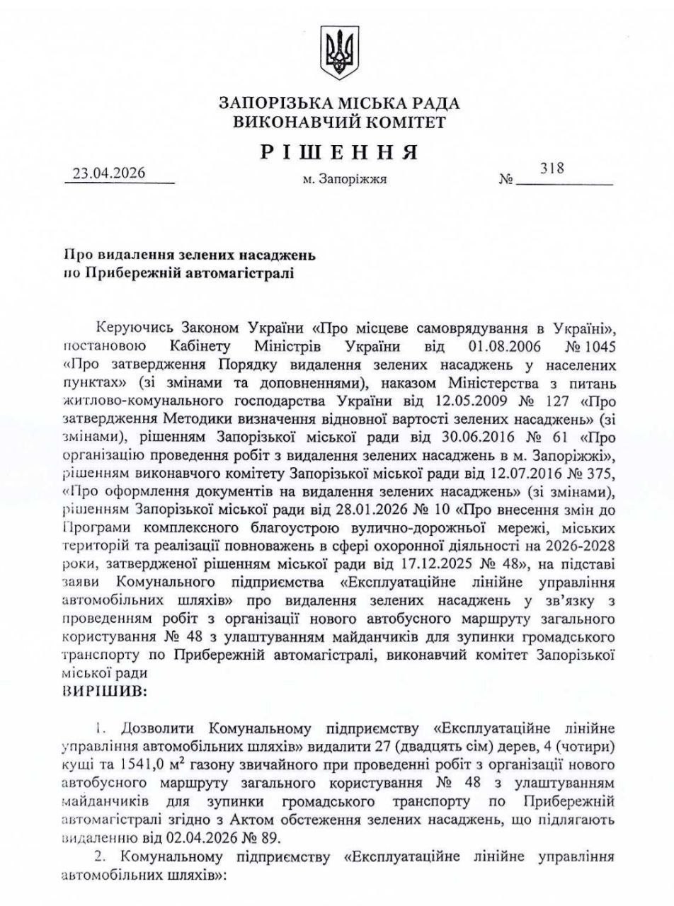 Згідно з документом, йдеться про знесення 27 дерев, 4 кущів та 1541 кв. м газону. Роботи передбачені в межах організації нового маршруту громадського транспорту та облаштування зупинок.
