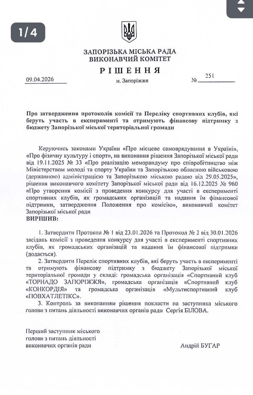 Згідно з документом, затверджено протоколи засідань конкурсної комісії, яка визначила перелік громадських організацій та спортивних клубів, що отримають фінансову допомогу. Йдеться про три організації: «Торнадо Запоріжжя», «Конкордія» та мультиспортивний клуб «Повхатлетікс».