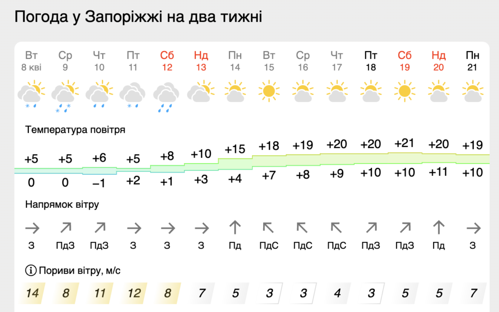 У Запоріжжі — весняна погода з зимовим характером. За даними синоптиків, у вівторок, 8 квітня, в місті очікується сніг із дощем, а також поривчастий вітер до 14 м/с. Така ж ситуація збережеться й у середу, 9 квітня, щоправда, з меншими вітрами — до 8 м/с. Температура вдень коливатиметься біля позначки +5°C, а вночі — до нуля.