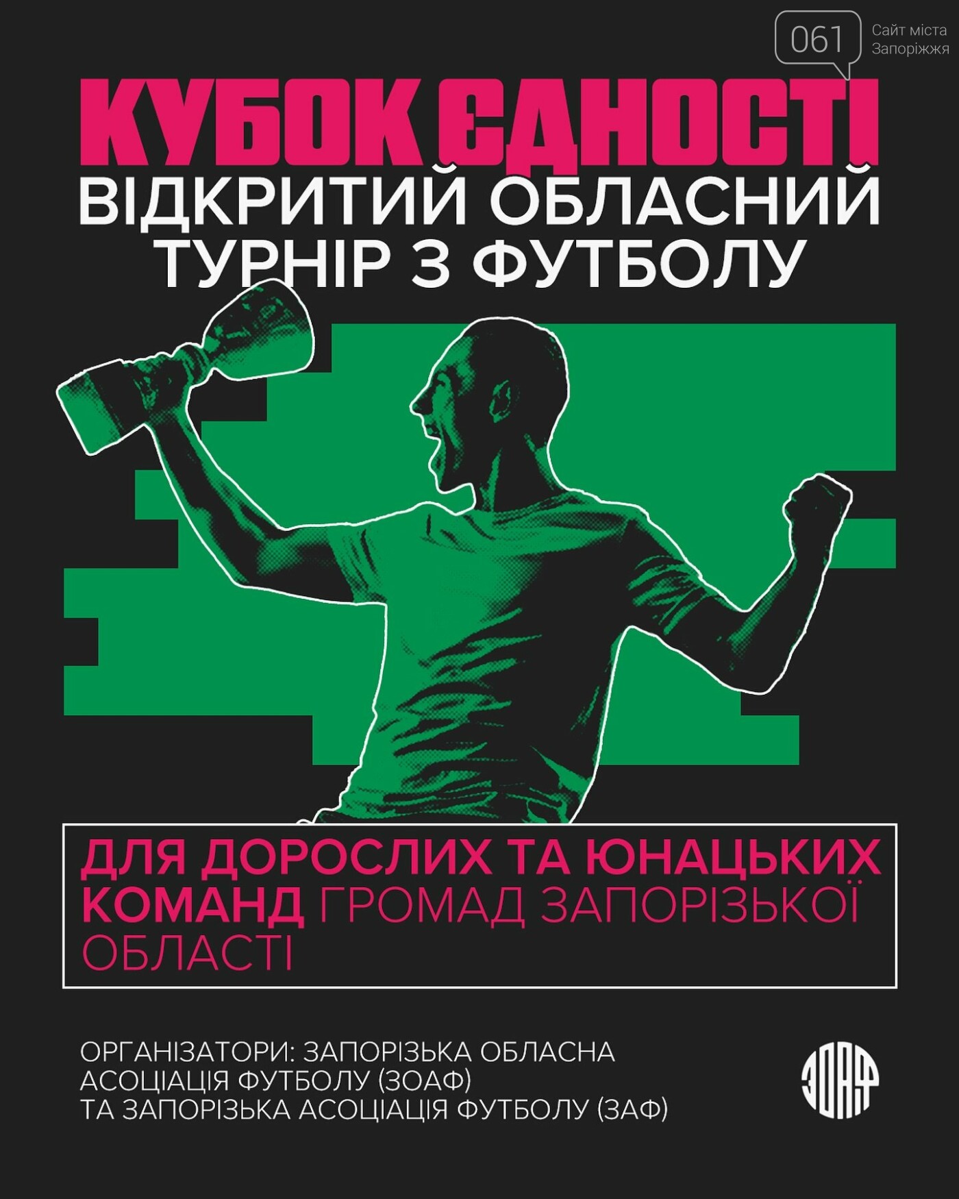 Вже у серпні 2025 року на території Запорізької області розпочнеться футбольний турнір «Кубок Єдності»Організаторами змагань виступають Запорізька обласна асоціація футболу (ЗОАФ) спільно із Запорізькою асоціацією футболу (ЗАФ).