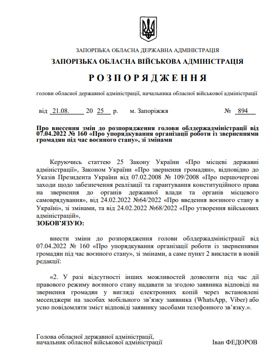Голова Запорізької обласної державної адміністрації, начальник обласної військової адміністрації Іван Федоров підписав розпорядження №894 від 21 серпня 2025 року, яким внесено зміни до порядку організації роботи зі зверненнями громадян у період дії воєнного стану.