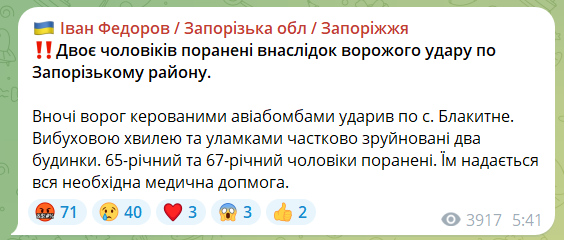 “65-річний та 67-річний чоловіки поранені. Їм надається вся необхідна медична допмога”, — повідомив очільник ЗОВА Іван Федоров.