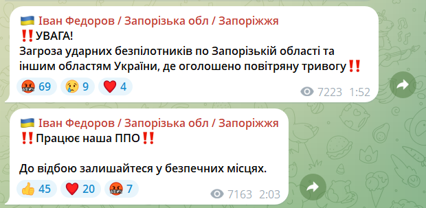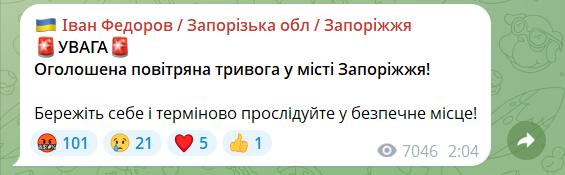 Близько 2:03 очільник ЗОВА Іван Федоров повідомив про роботу ППО. Однак, о 2:04 повітряна тривога була оголошена вже і в самому Запоріжжі.