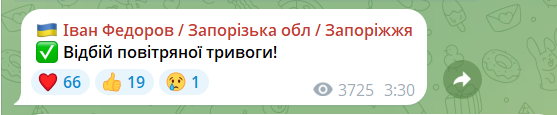 О 1:51 було оголосшено повітряну тривогу у громадах області (за винятком Запоріжжя), попереджаючи про загрозу ударних дронів.