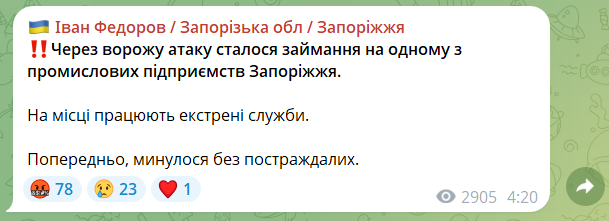 О 4:20 голова ОВА повідомив про наслідки атаки: через ворожий обстріл сталася пожежа на одному з промислових підприємств Запоріжжя.