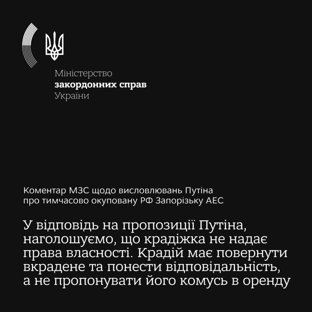 В українському міністерстві закордонних справ відреагували на висловлювання президента РФ путіна щодо подальшої долі ЗАЕС.