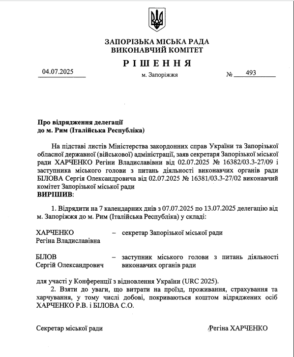 Запорізька міська рада відрядила делегацію з двох осіб до Риму (Італія) для участі у Конференції з відновлення України (URC 2025), яка відбудеться з 7 по 13 липня 2025 року.