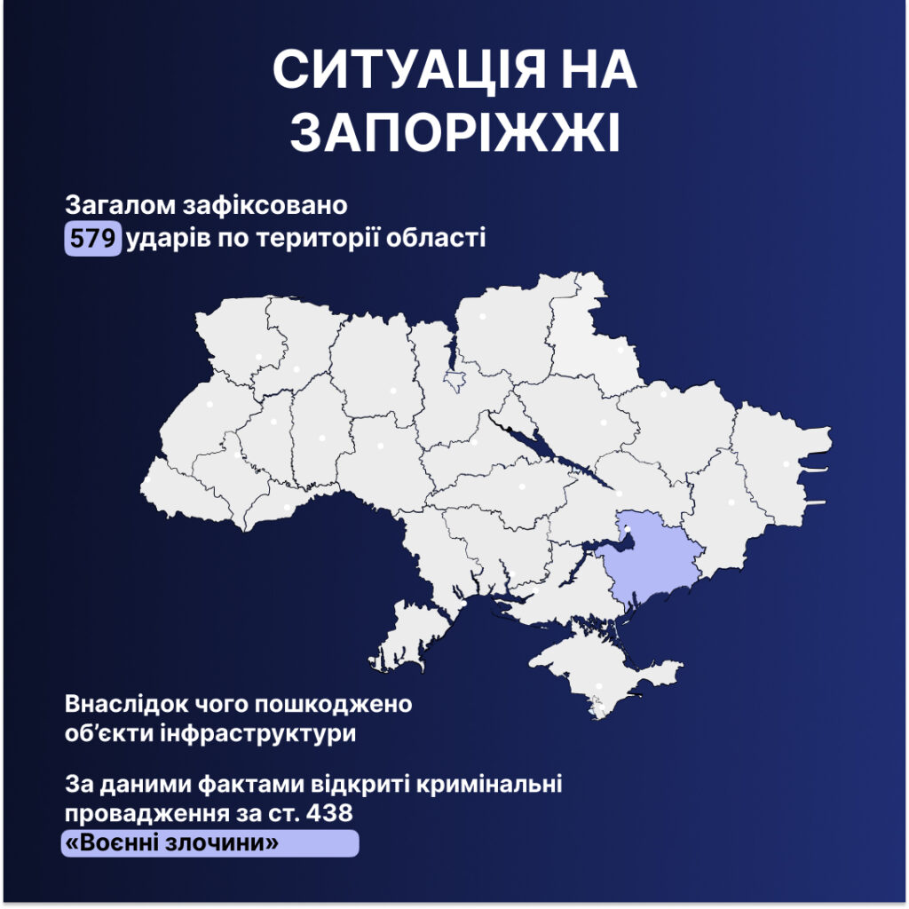 Росіяни цілили по Малокатеринівці, Степногірську, Приморському, Кам’янському, Плавнях, Оріхову, Гуляйполю, Щербаках, Новоданилівці, Малій Токмачці, Чарівному, Полтавці та інших населених пунктах. Поліція зареєструвала 30 фактів пошкодження приватних будинків, квартир, господарських споруд. Спільно з СБУ правоохоронці документують наслідки обстрілів, розслідуючи їх як воєнні злочини – за ч. 1 ст. 438 Кримінального кодексу України.