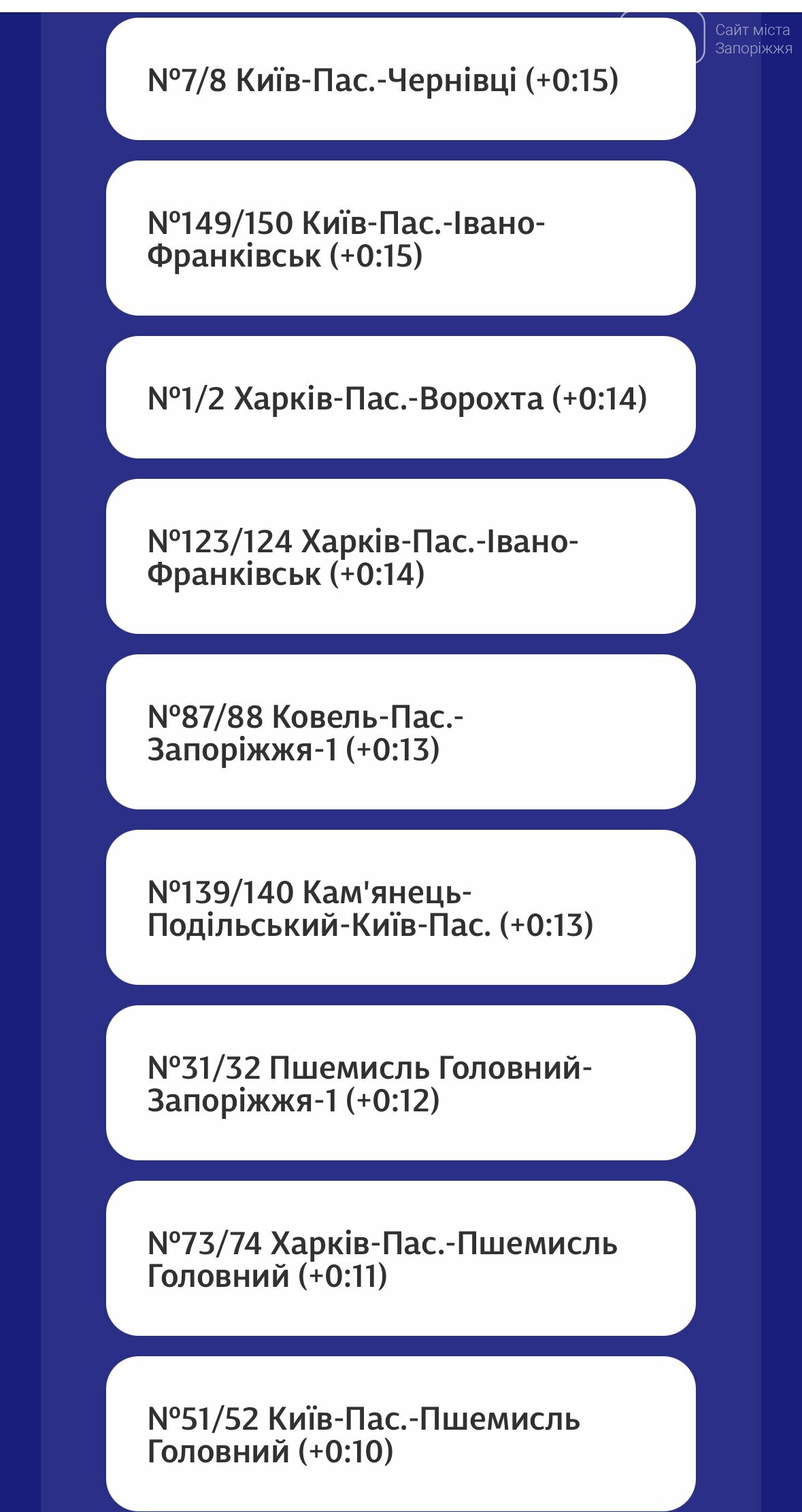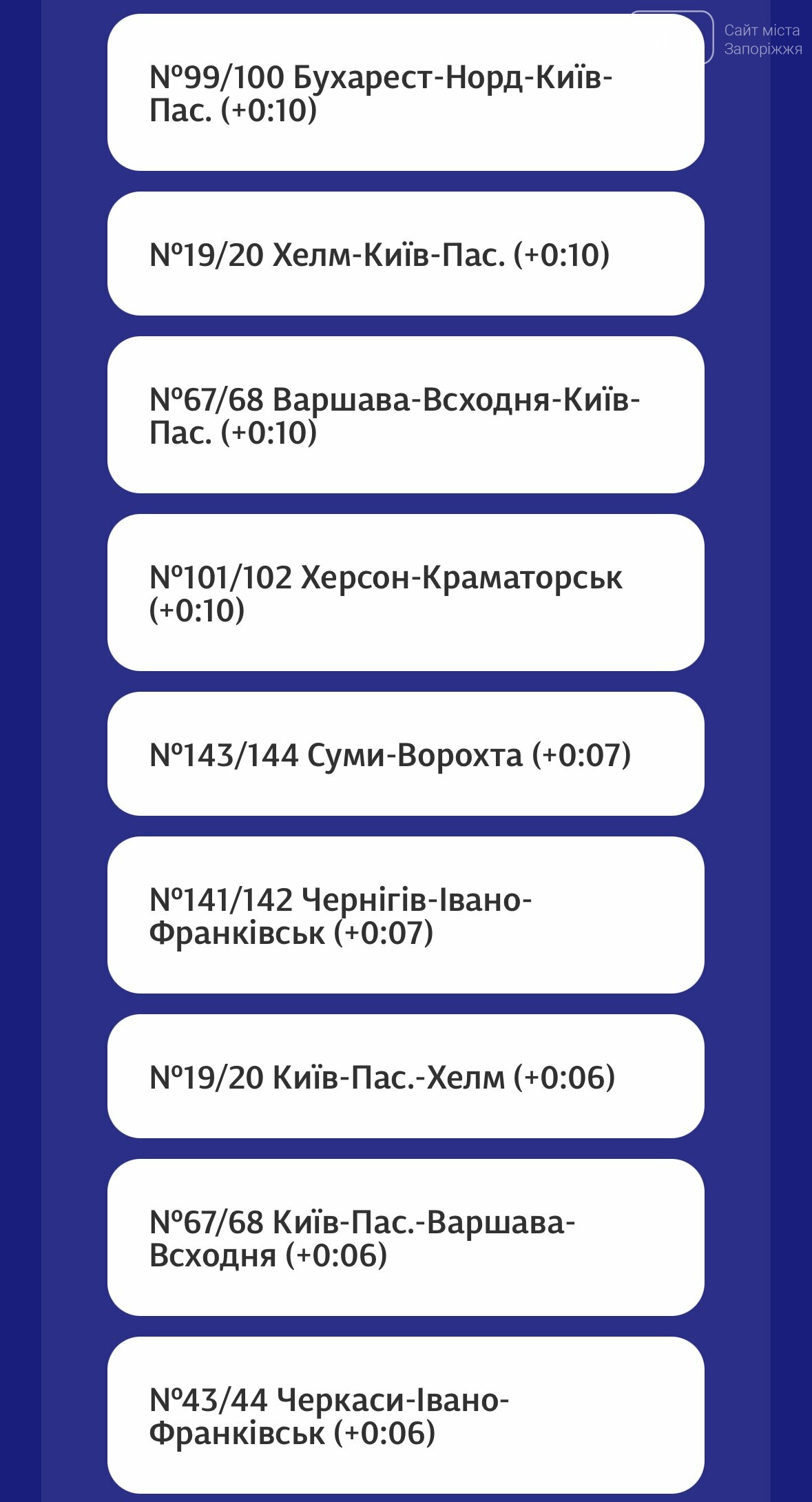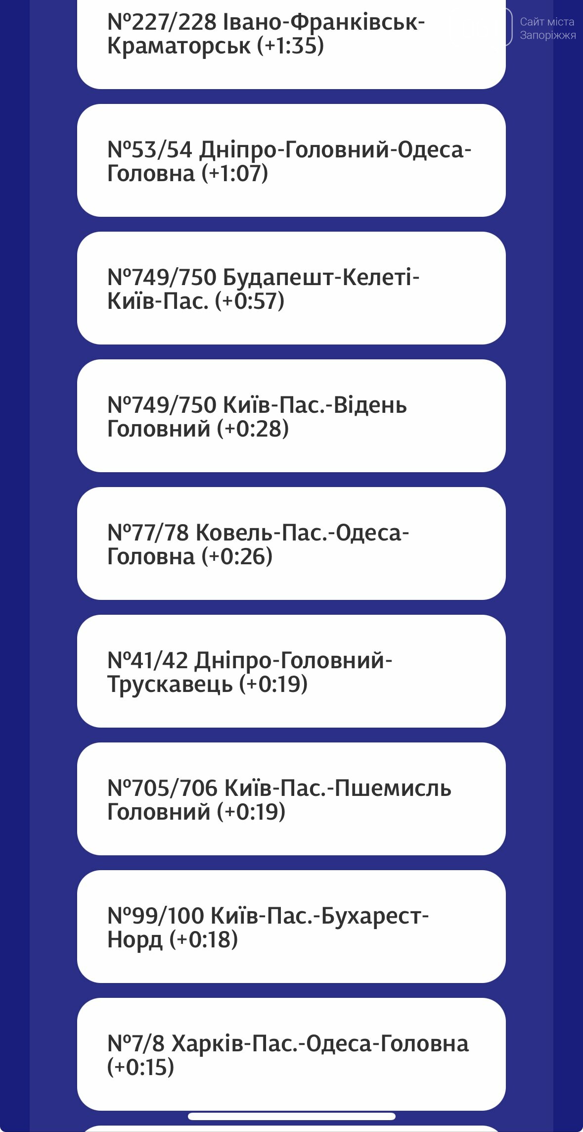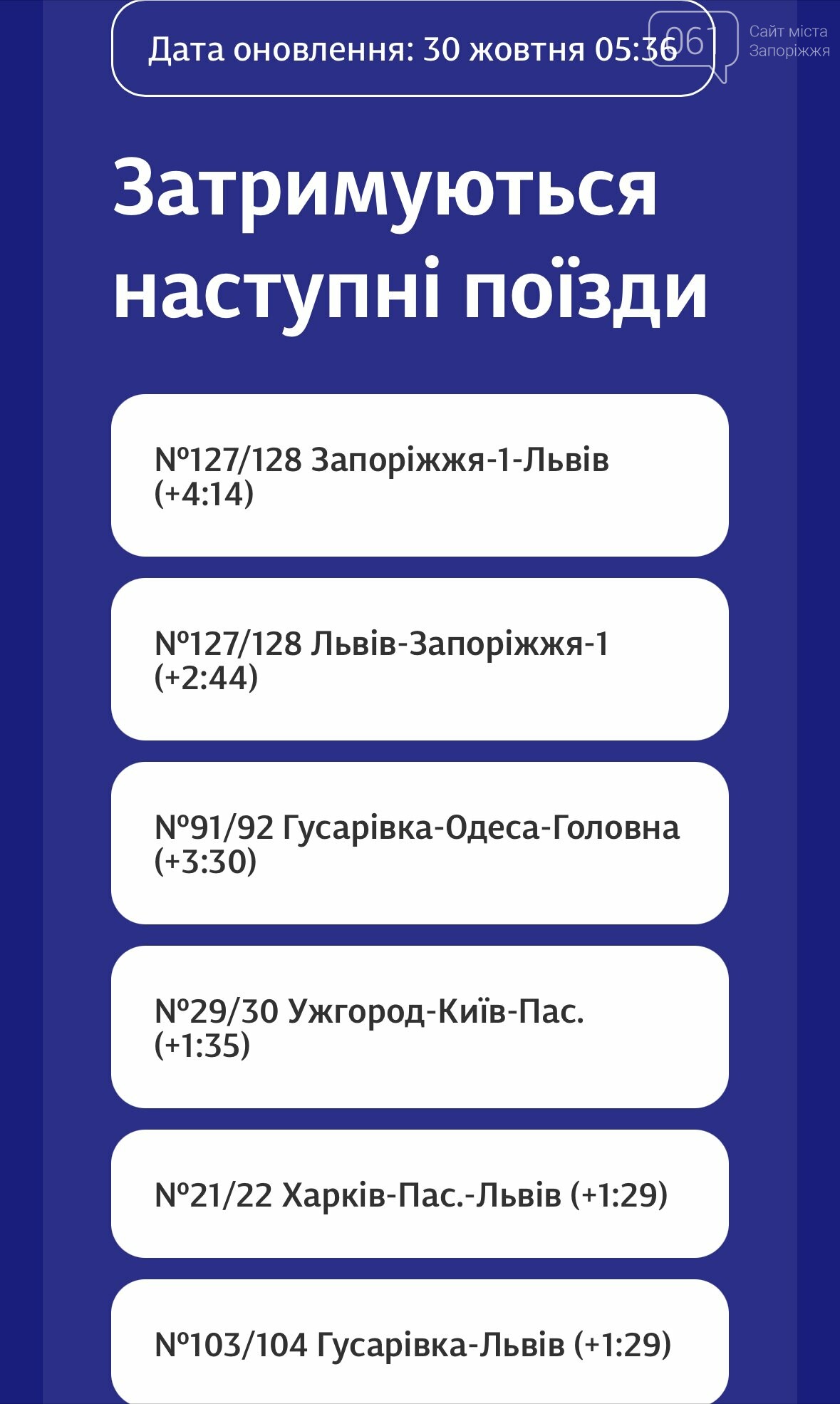 Через ворожі обстріли та знеструмлення в розкладі руху поїздів є значні зміни. В переліку поїздів, що йтимуть із затримкою в кілька годин, є і запорізький напрямок.