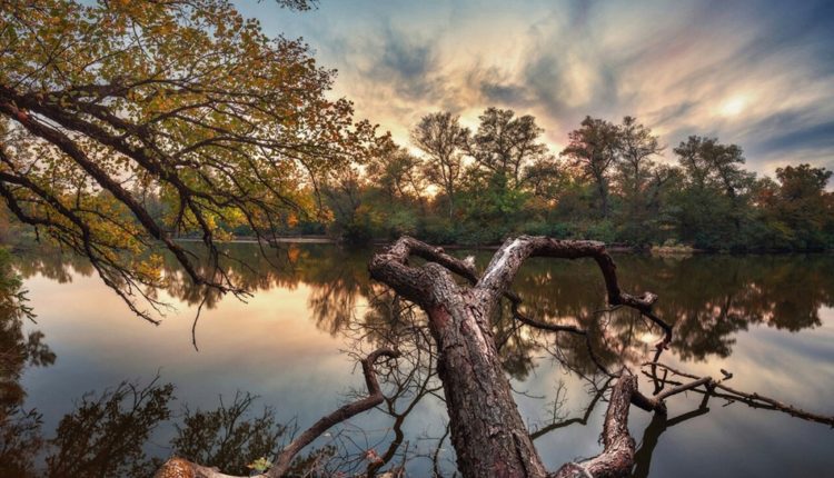 На снимках под необычным углом панорамной съемки берег Хортицы с лилиями и разноцветными деревьями.