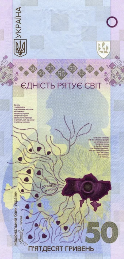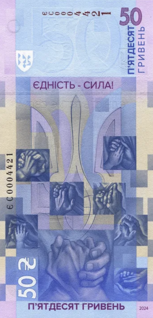 Національний банк України презентував нову пам’ятну банкноту номіналом 50 гривень із назвою «Єдність рятує світ». Вона присвячена солідарності демократичних держав, які об’єдналися у протистоянні російській агресії. Її головна особливість – вертикальне оформлення, що помітно вирізняє банкноту серед стандартних зразків.