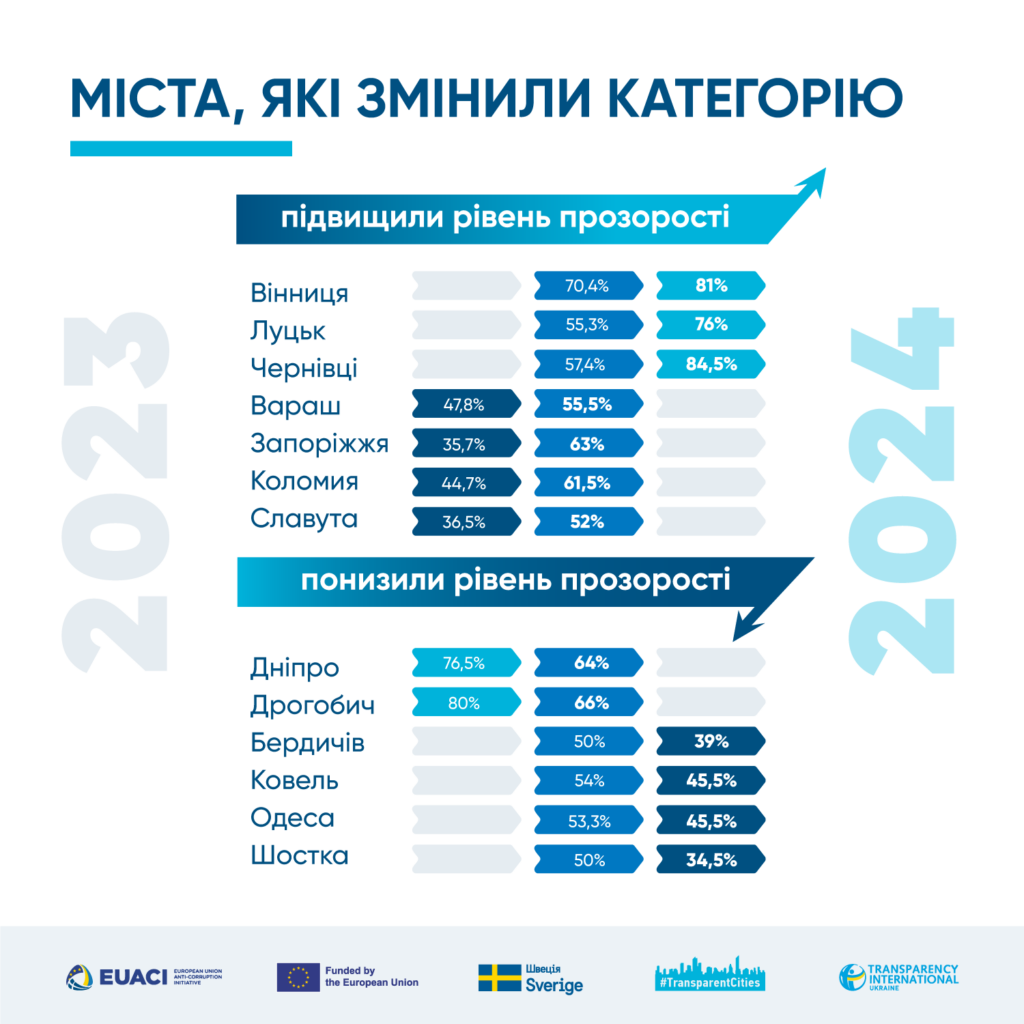 Середній рівень прозорості 100 міст — 41,6%. 7 міст підвищили категорію: Вінниця, Луцьк, Чернівці, Вараш, Запоріжжя, Коломия, Славута. За рік 37 міських рад покращили свою прозорість на 10% і більше. Хоча були й ті, що стали менш прозорими: Дніпро та Дрогобич втратили статус «прозорих», а Бердичів, Ковель, Одеса та Шостка – статус «частково прозорих».