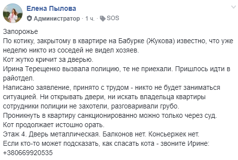 Источник: https://golos.zp.ua/proisshestvija/180238/v-zaporozhe-iz-zapertoj-kvartiry-istoshno-krichit-kot-foto
