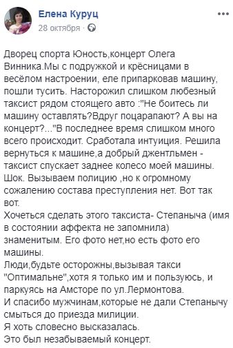 Так, в одной из соцсетей жительница Запорожья пожаловалась, что перед тем как пойти на концерт Винника, она припарковала свою машину. Когда вернулась, то увидела, как таксист спускает колесо на ее автомобиле.