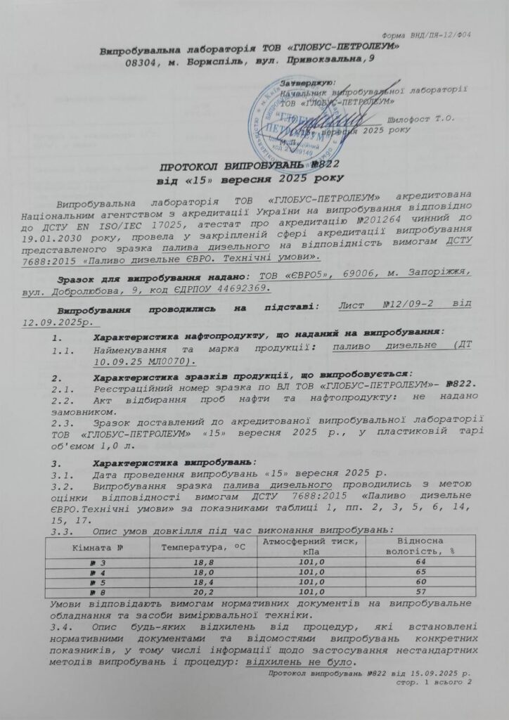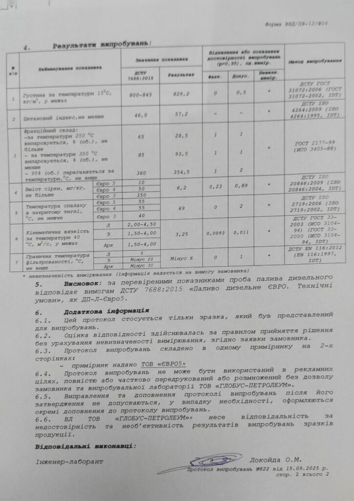- Дизельне пальне (протокол №822) — відповідність ДСТУ 7688:2015, як паливо дизельне ДП-Л-Євро5.