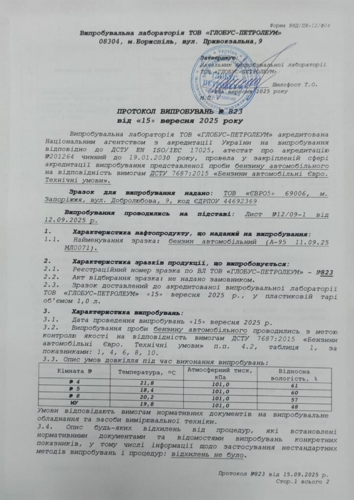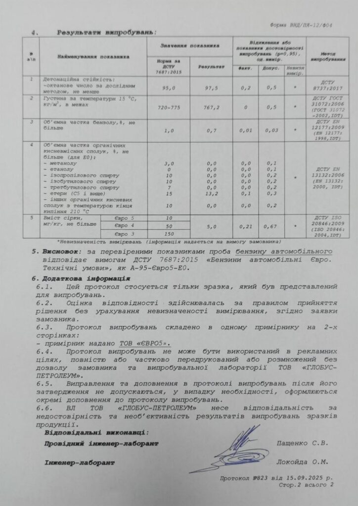 - Бензин А-95 (протокол №823) — повна відповідність ДСТУ 7687:2015, як бензин А-95-Євро5-Е0.