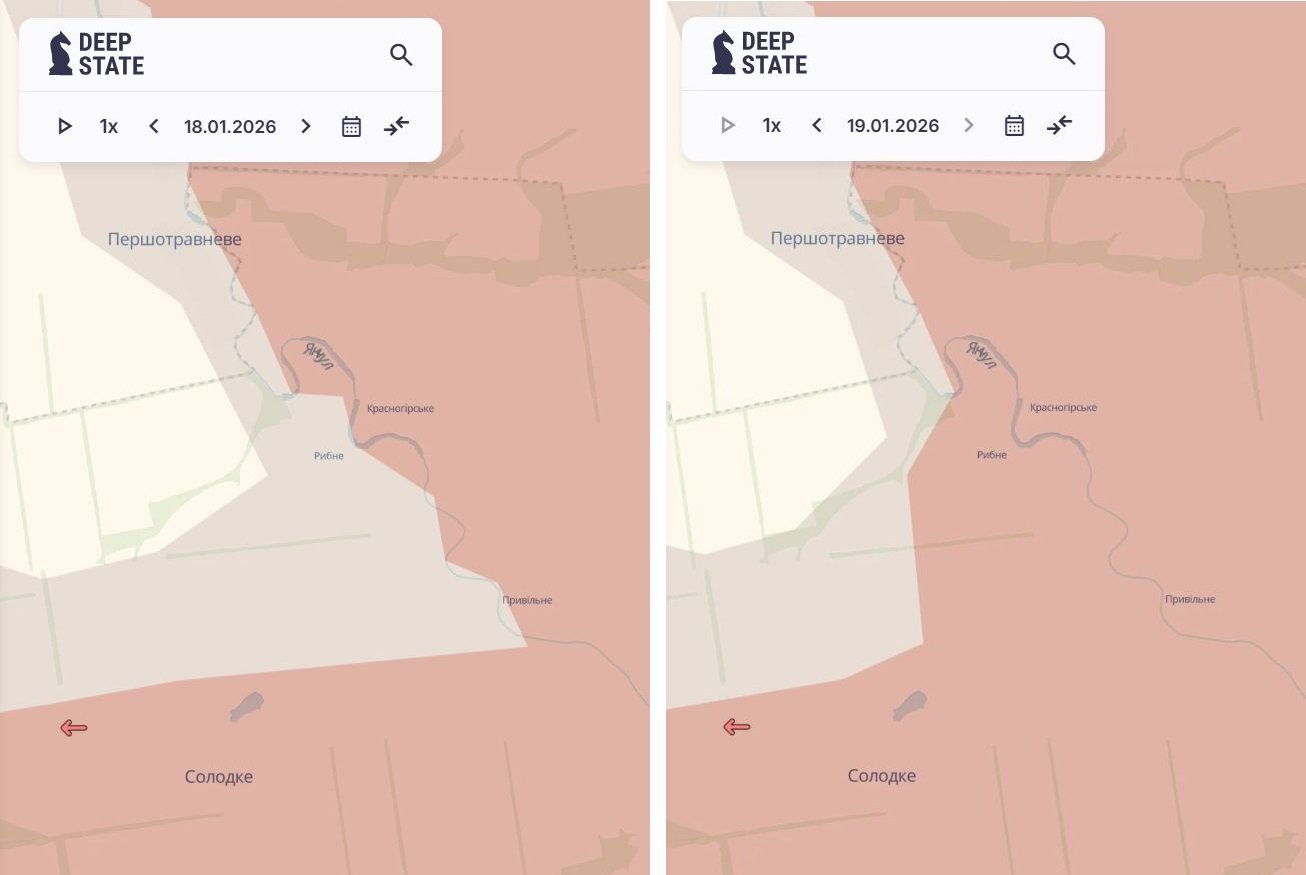 Ворог просунувся в районах Покровська і Родинського Донецької області, а також окупував Рибне і зайняв території в районі Солодкого Запорізької області. Про це повідомив OSINT-проєкт DeepState 20 січня.