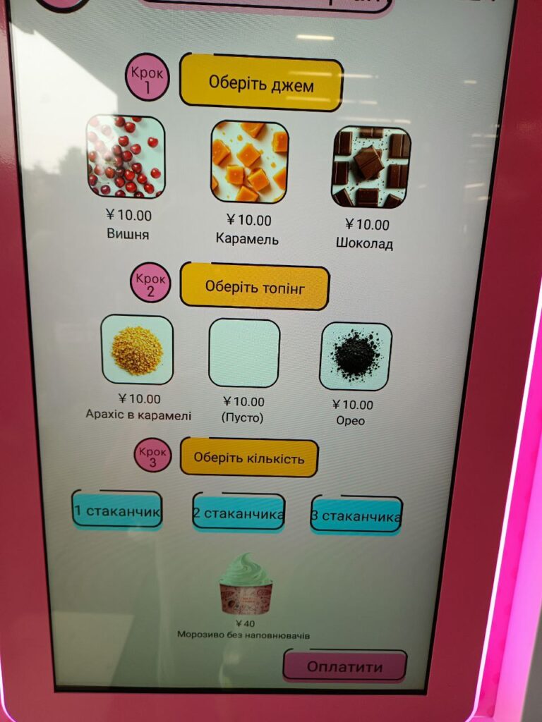 У супермаркеті одного з торговельних центрів Комунарського району Запоріжжя встановили інноваційний автомат із морозивом. Яскраво-рожевий пристрій одразу привертає увагу покупців, особливо дітей. На екрані можна не лише обрати смак, а й створити власну ідеальну комбінацію морозива.