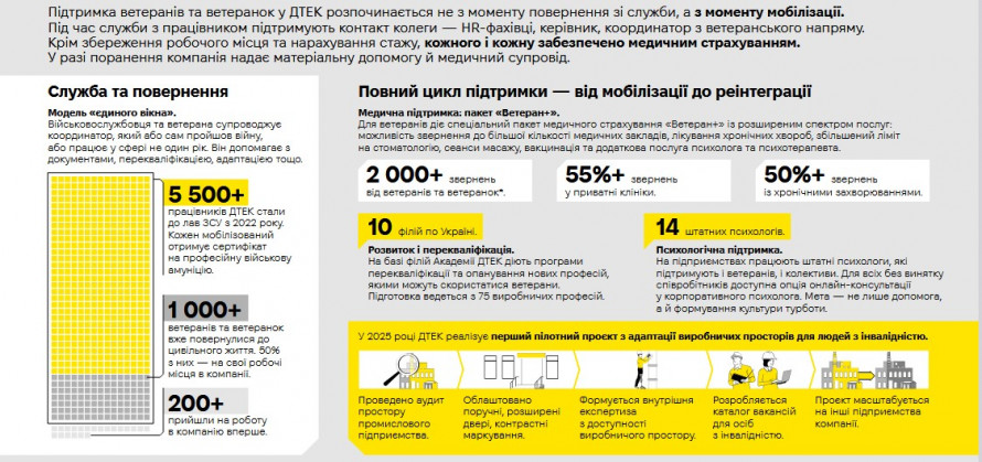 Також значну підтримку ветеранам надає компанія ДТЕК. Так, для захисників діє спеціальний пакет медичного страхування «Ветеран+» із розширеним спектром послуг. Він передбачає можливість звернення до більшої кількості медичних закладів, лікування хронічних хвороб, збільшений ліміт на стоматологію, сеанси масажу, вакцинацію та додаткову послугу психолога та психотерапевта.