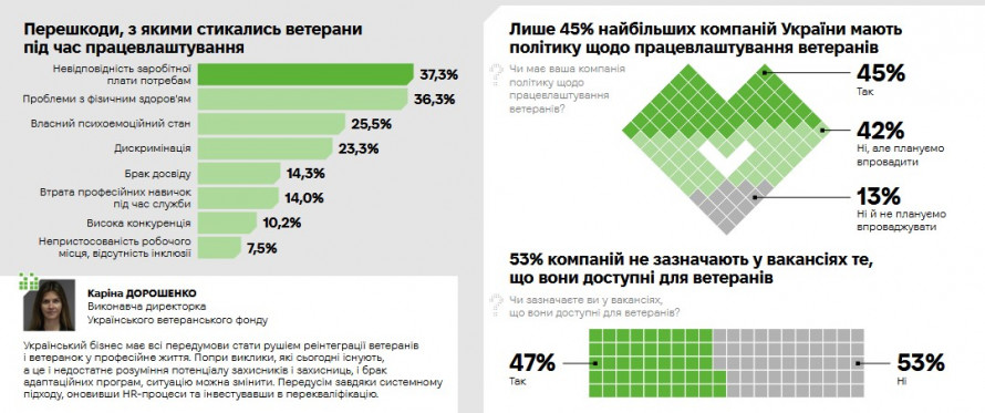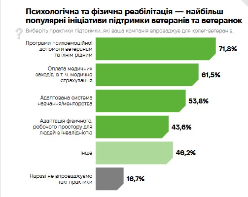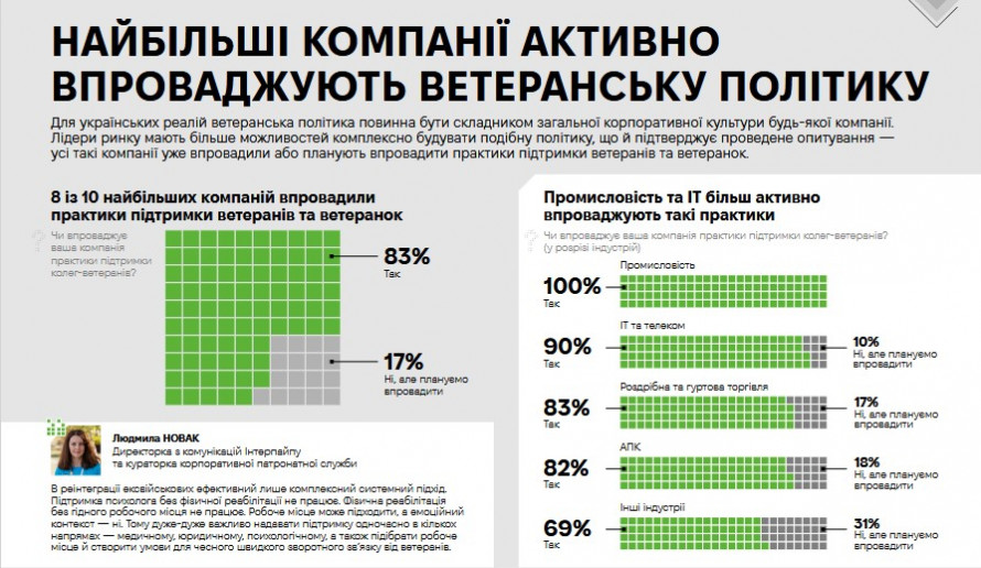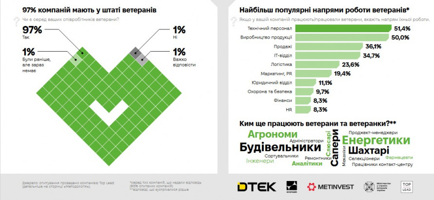 Результати показали, що 97% опитаних компаній мають у штаті ветеранів, а вісім із десяти найбільших компаній (83 %) впровадили практики підтримки для них.