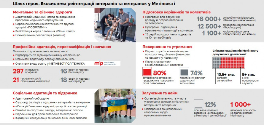 Крім того, у ветеранів є можливості для професійної адаптації, перекваліфікації і навчання. Вони можуть підвищити наявну кваліфікацію, отримати додаткову робочу спеціальність або отримати вищу освіту у виші «Метінвест Політехніка». Більше деталей — в інфографіці.