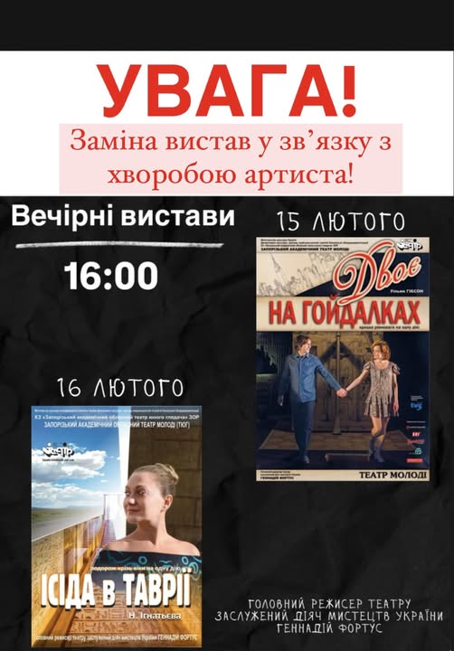 — 15 лютого о 16.00 — вистава «Двоє на гойдалках» (замість драми «Вальс випадку»), Мала сцена.