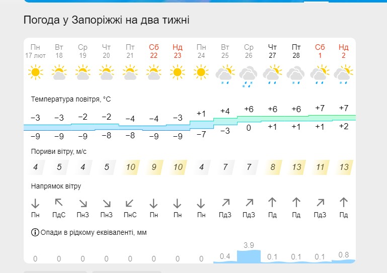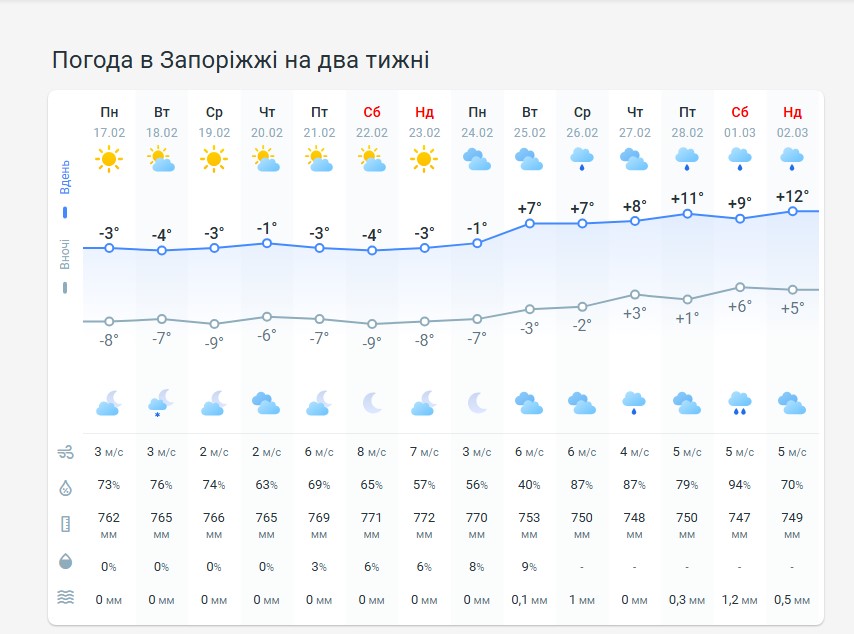 За даними онлайн-сервісів погоди, 17-23 лютого у Запоріжжі збережться морозна малохмарна погода. Вночі очікується до -8..-9 градусів, вдень -2..-4 градуси морозу. А вже з 24 лютого почнеться відлига. За даними Meteofor вдень повітря прогріватиметься до +6..+7 градусів. Можливі дощі.