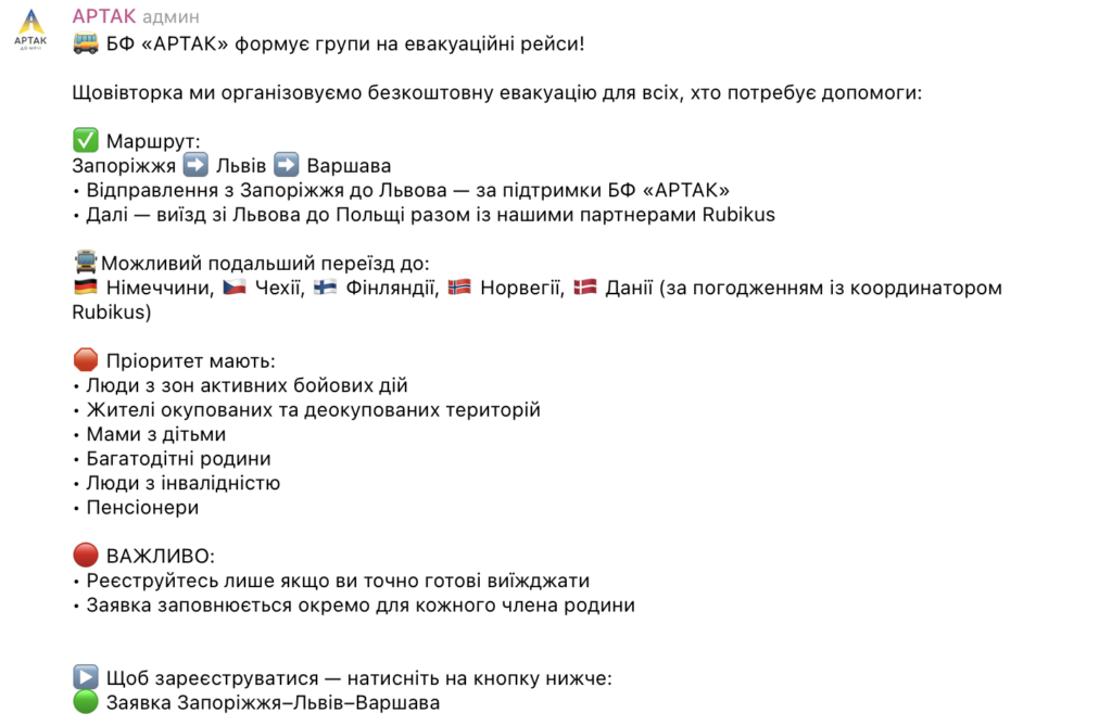 БФ «АРТАК» нагадує: кожен евакуаційний рейс — це результат співпраці багатьох волонтерів та партнерів, тому важливо дотримуватися порядку реєстрації та не створювати зайве навантаження на систему, подаючи некоректні або передчасні заявки.