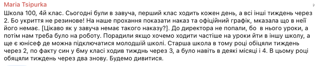 Батьки зазначають, що на початку навчального року у багатьох школах адміністрація запевняла: заняття проходитимуть щодня. Проте вже за кілька тижнів після старту почали запроваджувати змішаний графік – тиждень через два, а подекуди навіть із більшими перервами.