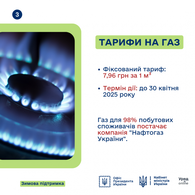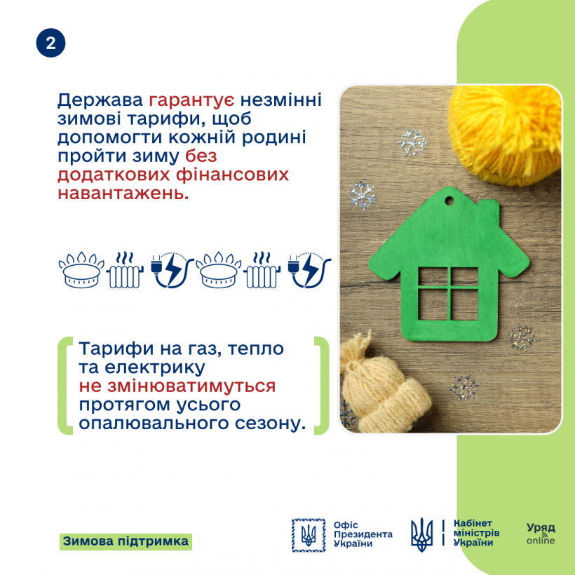 Тарифи на газ, тепло та електрику не змінюватимуться протягом цього опалювального сезону. Це частина Зимової підтримки – ініціативи Президента України Володимира Зеленського й Уряду, спрямованої на допомогу українським родинам. Про це повідомили у Кабінеті Міністрів України.