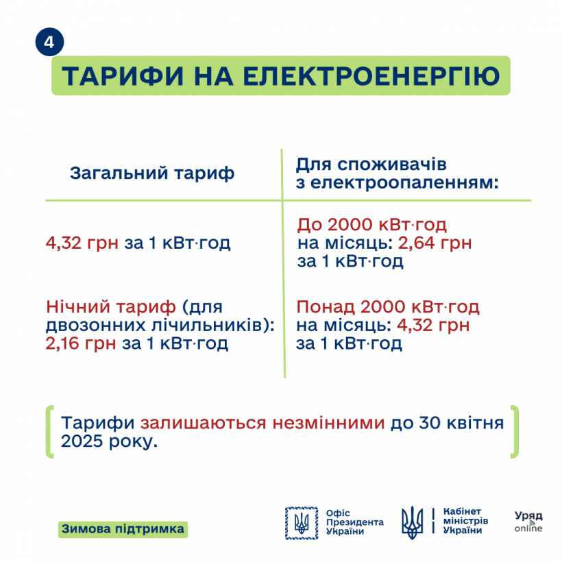 — для споживачів з електроопаленням — 2,64 грн/кВт-год для обсягу до 2000 кВт-год на місяць і 4,32 грн/кВт-год при перевищенні цього обсягу.