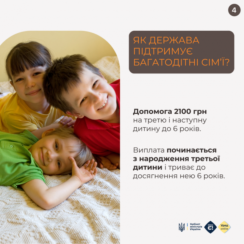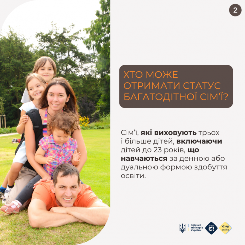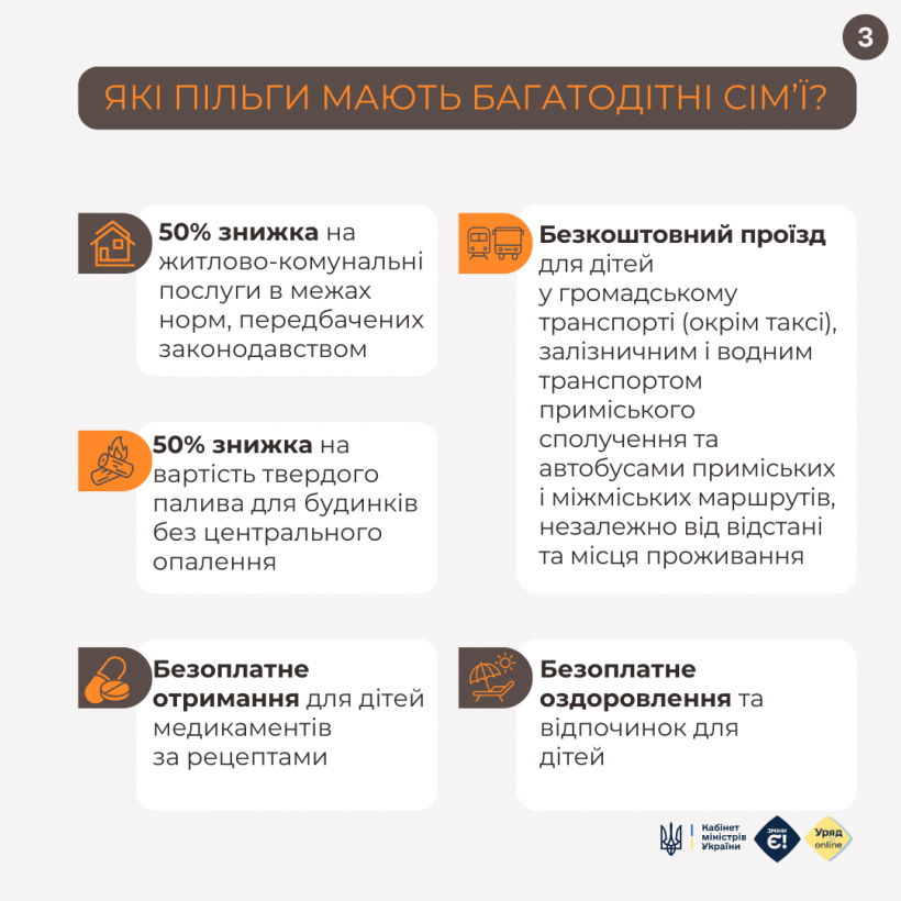 Зазначається, що родини, які виховують трьох і більше дітей, мають право на 50-відсоткову знижку на комунальні послуги, безкоштовні ліки за рецептами та проїзд у громадському транспорті для дітей. Крім того, держава надає щомісячну допомогу у розмірі 2 100 гривень на третю та наступну дитину до 6 років. Докладніше про умови отримання статусу та пільги – в інфографіці нижче.