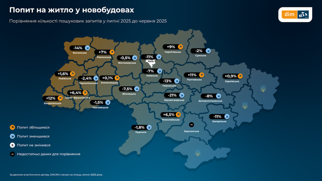У липні в Україні фіксується різноспрямована динаміка попиту на новобудови. У Закарпатській області він зріс на 12 %, у Полтавській — на 11 %, у Чернігівській — на 9 %. Натомість у Кіровоградській області падіння склало 21 %, а у Волинській — 14 %. У Запорізькій області попит на первинне житло залишається помірним і не демонструє різких коливань.