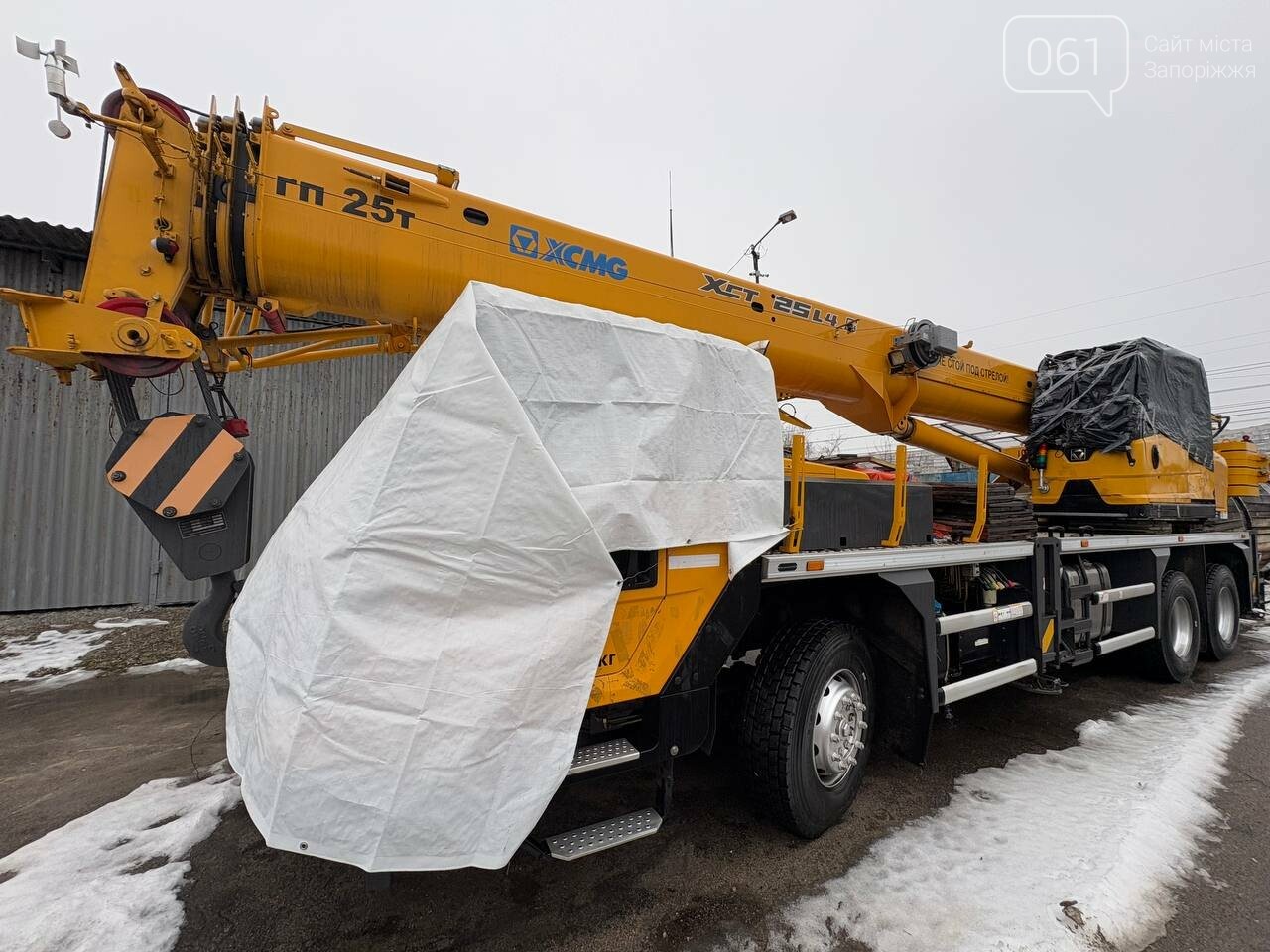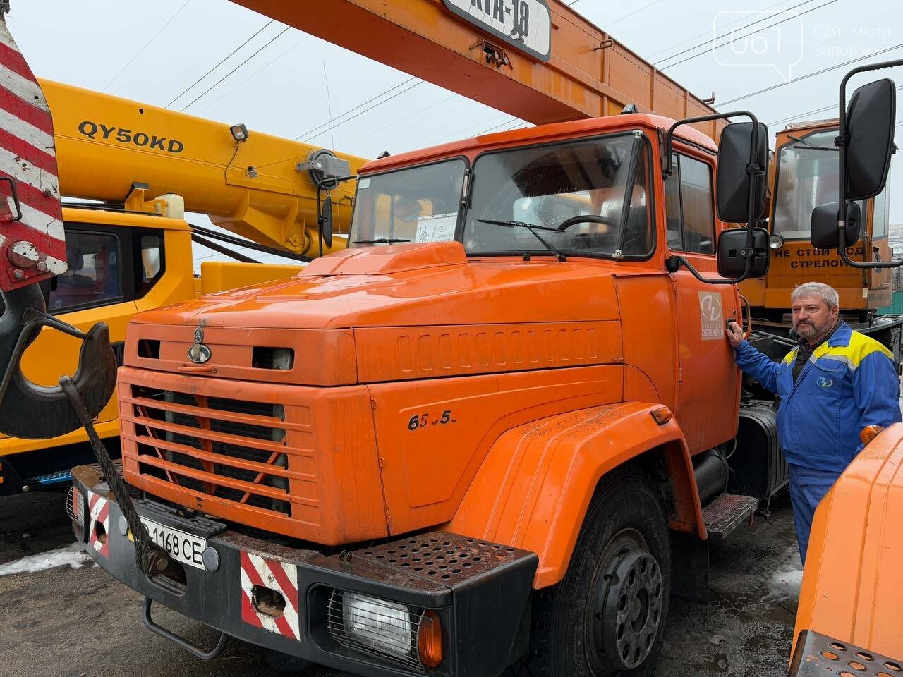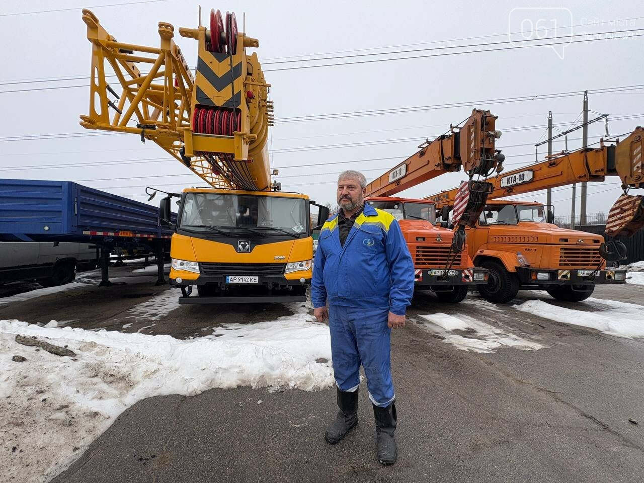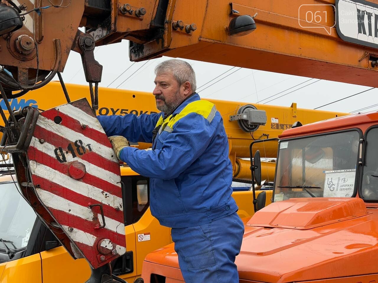 Ми зустрілися з ним близько 8:00 ранку. В цей час саме закінчились робочі наради, бригади отримали “інструкцію”, на яких об’єктах працюють. Пан Олексій мав їхати у Вільнянськ, бо вночі ворог атакував дронами місто, пошкодивши інфраструктуру, житлові будинки, та вбив трьох людей. Чоловік підводить до крану. Кабіна водія закрита плівкою. Виявляється, що це саме той кран, на якому Олексій працював в той день, коли стався повторний обстріл.
