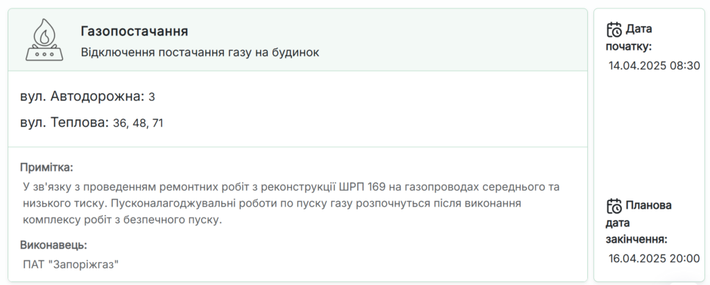 З 08:30 понеділка, 14 квітня 2025 року, у Запоріжжі буде тимчасово припинене газопостачання в окремих будинках у зв’язку з проведенням ремонтних робіт. Про це повідомляє «Контакт-Центр м. Запоріжжя».